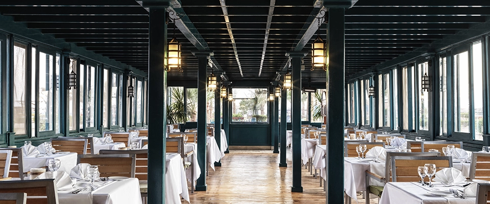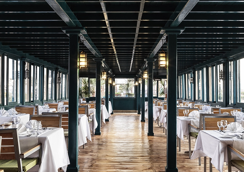 Club Paradisio’s main restaurant, Marco Polo, serves decadent international buffets featuring live cooking stations that change daily. Accessed by two wooden bridges above a saltwater lagoon – which also serve as outdoor terraces – the spacious indoor dining area features high ceilings, elegant marble floors and large glass windows offering breathtaking views of the Red Sea.