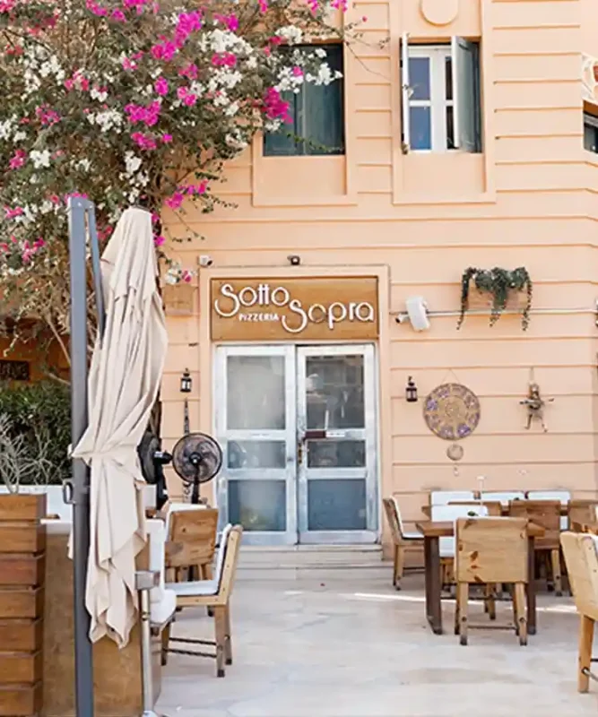 Sotto Sopra El Gouna is a popular pizzeria and Italian restaurant in El Gouna’s Marina. The menu includes a range of thin-crust pizzas – all available with vegan cheese – and everyone’s favourite pasta, gnocchi and risotto dishes. It’s a lovely spot for Italian food in El Gouna, with Marina views.